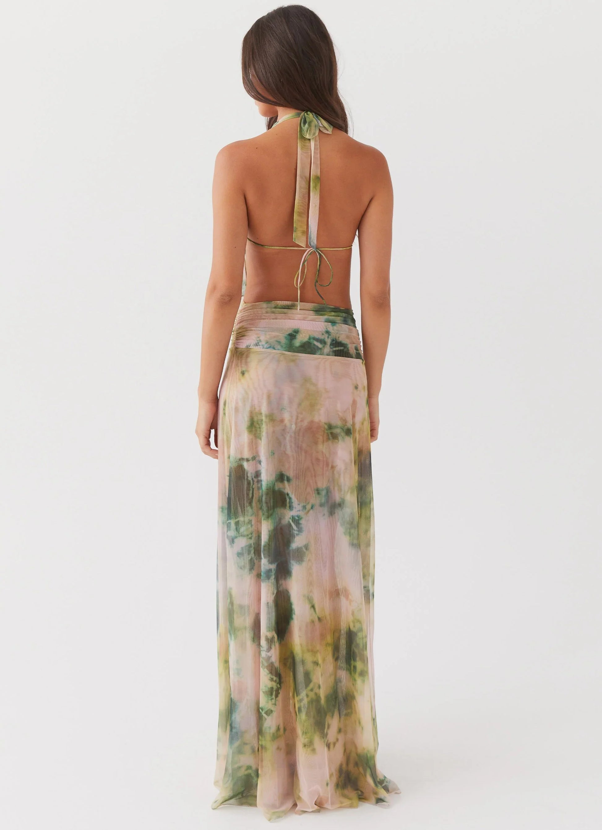 The Elysia Maxi Dress is a show-stopping piece designed to captivate. Crafted from a lightweight, sheer fabric with a dreamy watercolor tie-dye print, it flows effortlessly with every step. Featuring a daring draped cowl neckline, open back, and halter tie closure, this dress exudes modern allure and sophistication.